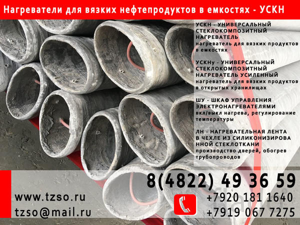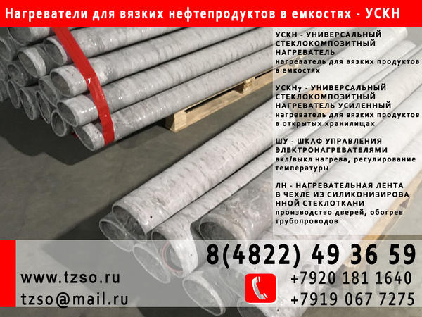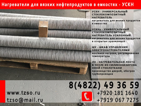 Назначение. Универсальный стеклокомпозитный нагреватель (УСКН) предназначен для разогрева и поддержания температуры вязких нефтепродуктов, битума, гудрона, мазута, масла, агрессивных диэлектрических сред в емкостях, хранилищах, цистернах, различных резервуарах, а также воздушных и невзрывоопасных газовых сред.